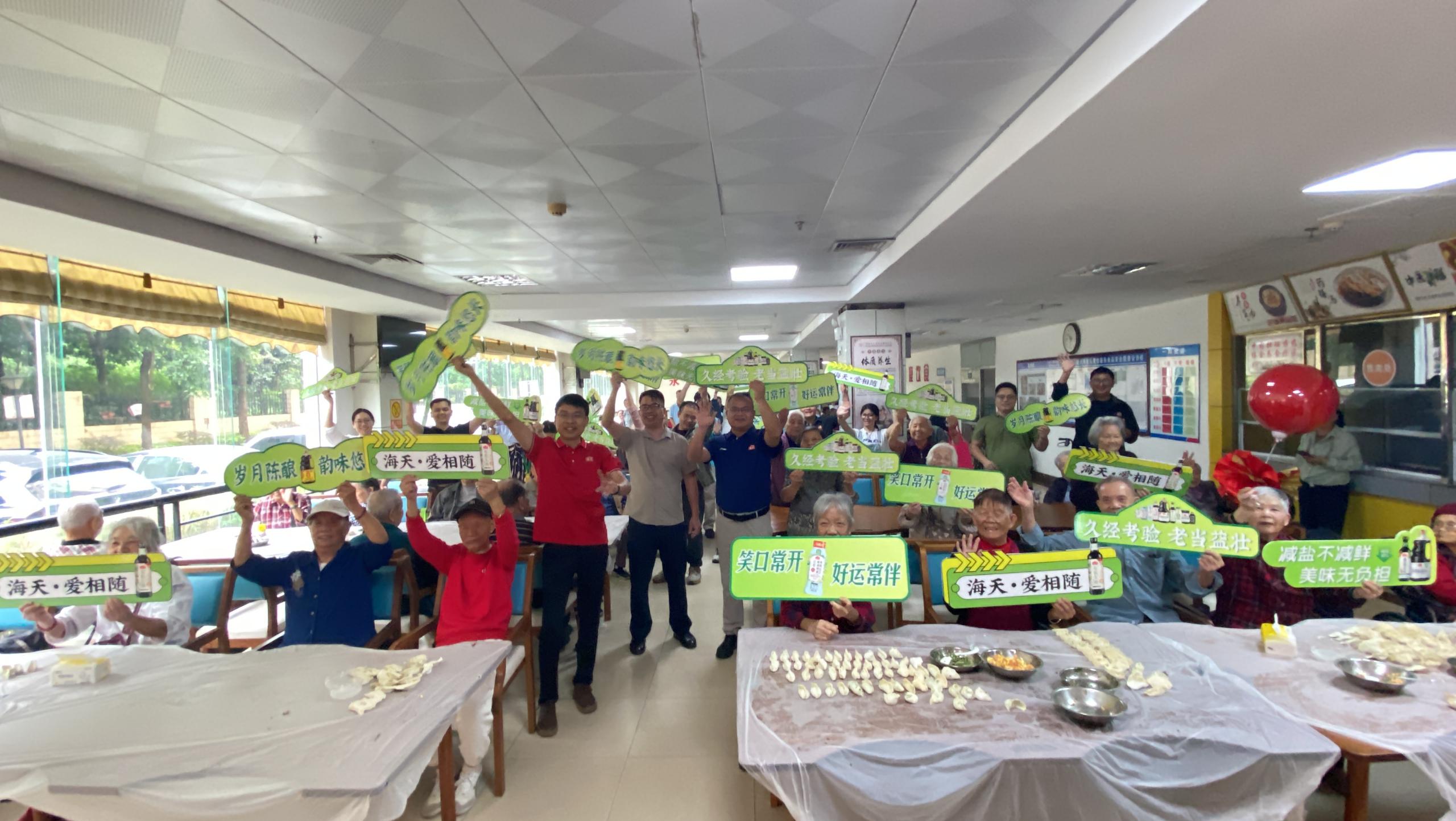 在广西南宁,海天华西南营销公司志愿队和南宁海天志愿服务队在2所敬老院开展活动,一些重点照护,不便下楼的长者,志愿者们也一对一地送上祝福,另外还和长者现场一起包饺子、吃饺子,并科普减盐减油科普知识。
