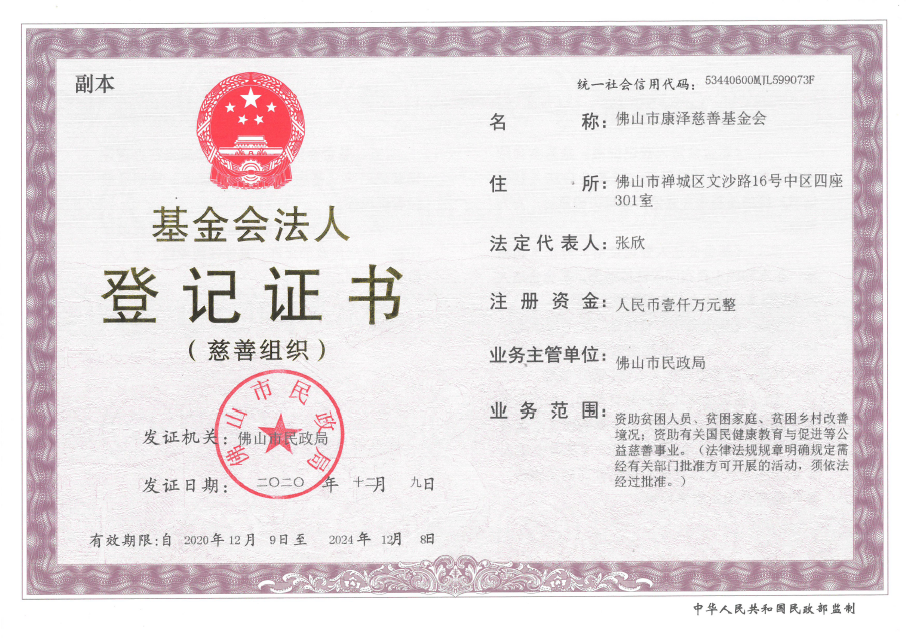 2020年12月9日,佛山市康泽慈善基金会正式注册成立。
