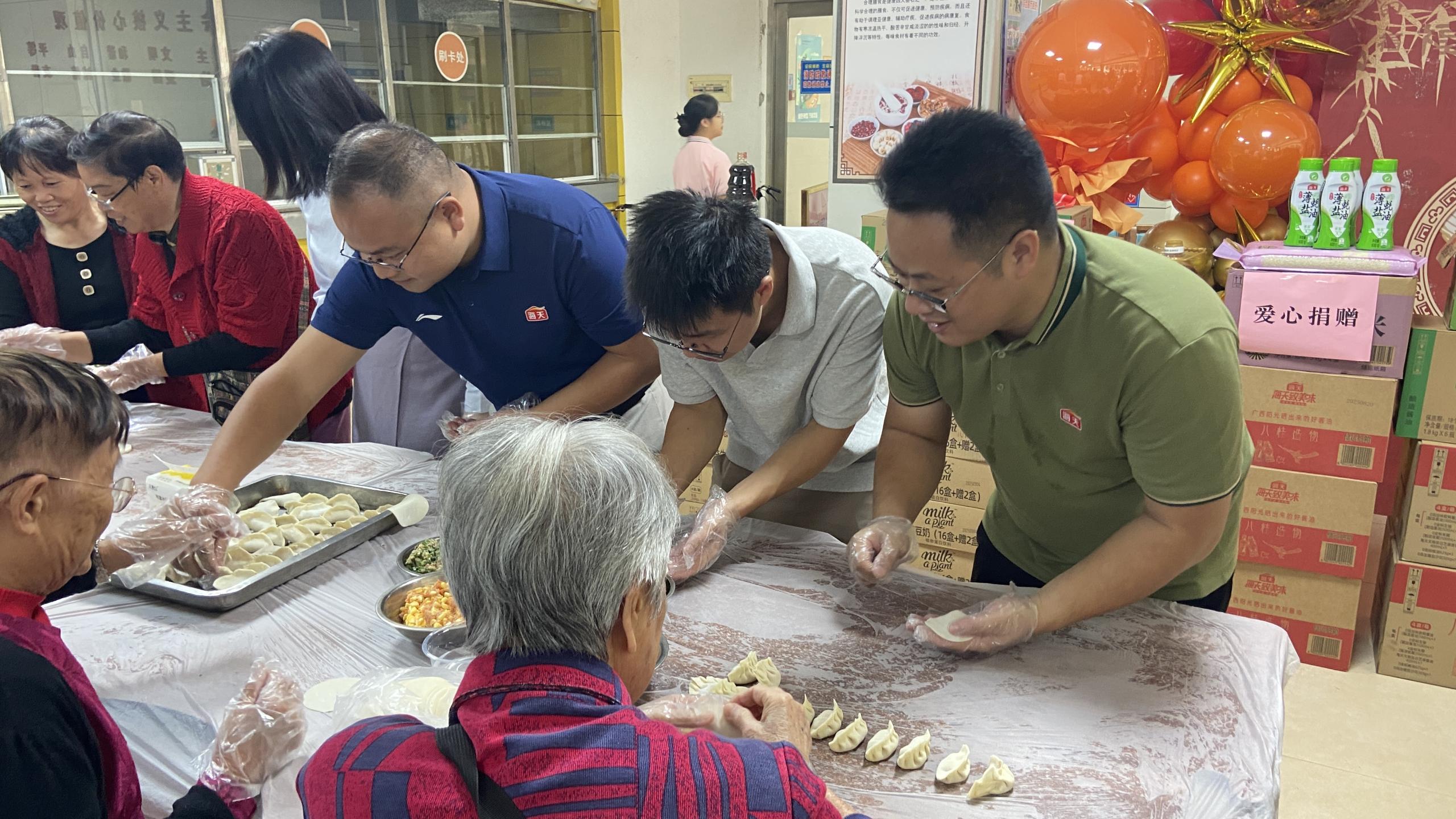 在广西南宁,海天华西南营销公司志愿队和南宁海天志愿服务队在2所敬老院开展活动,一些重点照护,不便下楼的长者,志愿者们也一对一地送上祝福,另外还和长者现场一起包饺子、吃饺子,并科普减盐减油科普知识。